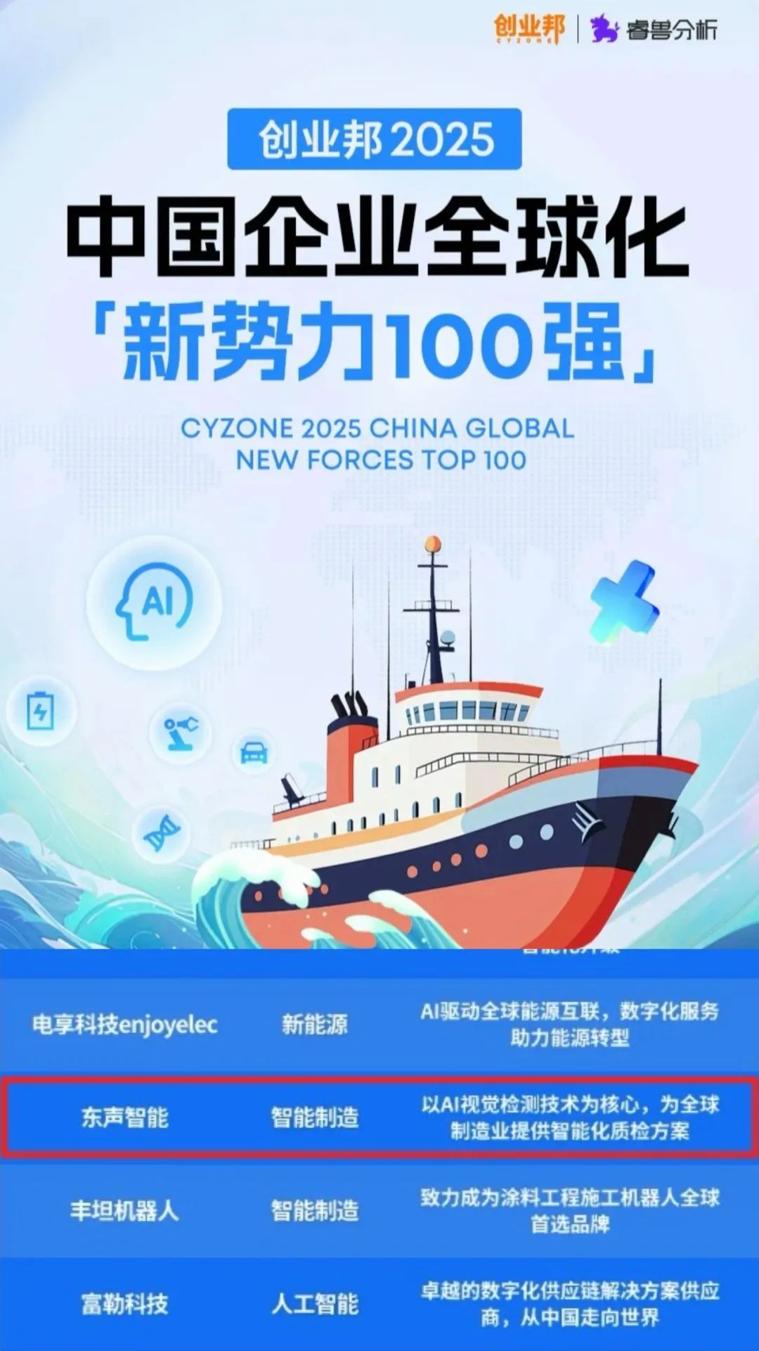 From addressing quality inspection challenges in China's manufacturing sector to enabling intelligent upgrades across the global industrial chain, Dongsheng's growth trajectory exemplifies the leapfrog development of Chinese tech companies from "following" to "leading." This recognition on Cyzone's "2025 Top 100 Emerging Forces of Chinese Enterprises in Globalization" list is both an honor and a responsibility. Moving forward, Dongsheng Intelligence will continue to wield AI as its sword and innovation as its sail, charting a new chapter for China's intelligent manufacturing in the vast expanse of high-end manufacturing.